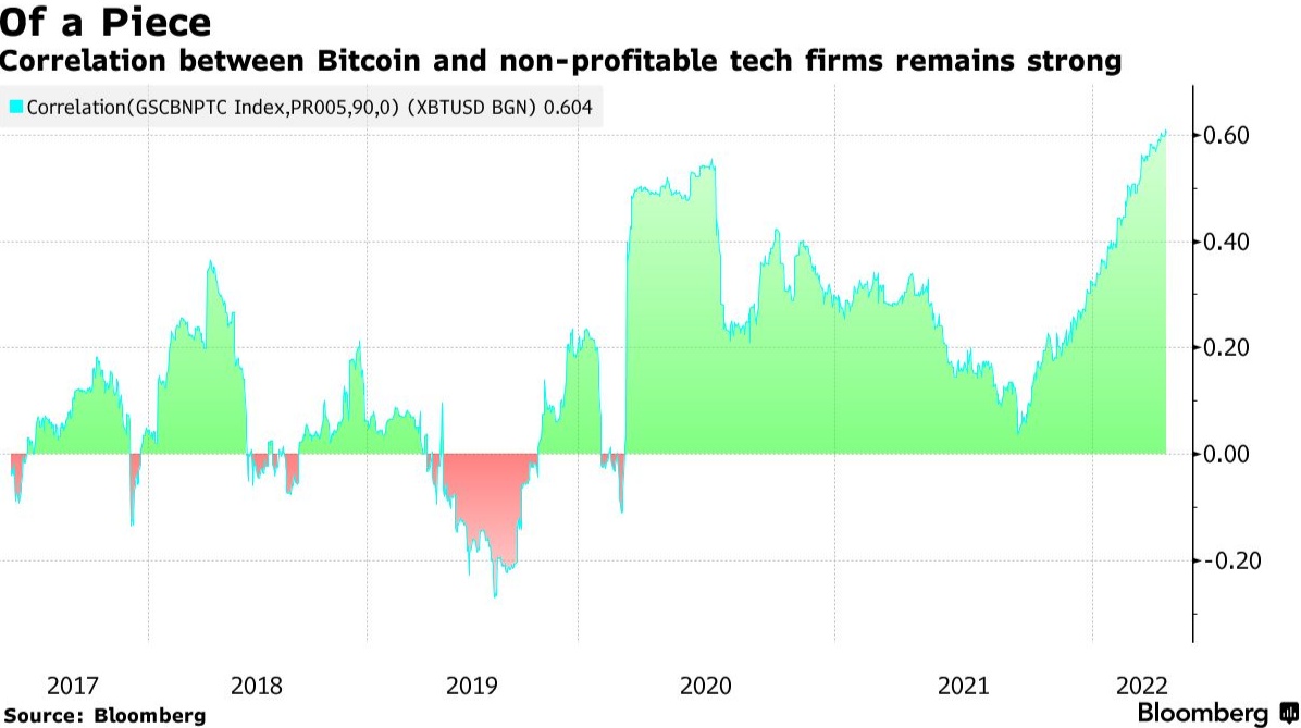 一个经常被引用的衡量标准是比特币与传统市场其他领域的相关性,这些领域可能会在利率上升的环境中受到伤害。该加密货币与一篮子非盈利科技股的90天相关系数目前高于0.60,为历史最高水平。(系数为1表示资产走势一致,而系数为-1则表示资产走势相反。)