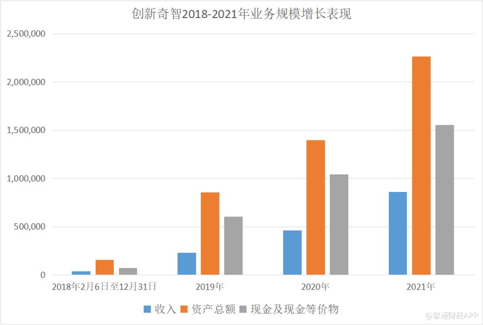 截至2018-2021年度,创新奇智营业收入分别达到3720万元、2.29亿元、4.62亿元、8.61亿元人民币,复合年增长率达185%;总资产规模由2018年的1.58亿元人民币增至22.65亿元,复合年增长率达142.82%;现金及现金等价物也由7439.6万元增至15.53亿元人民币,复合年增长率达到175.35%。
