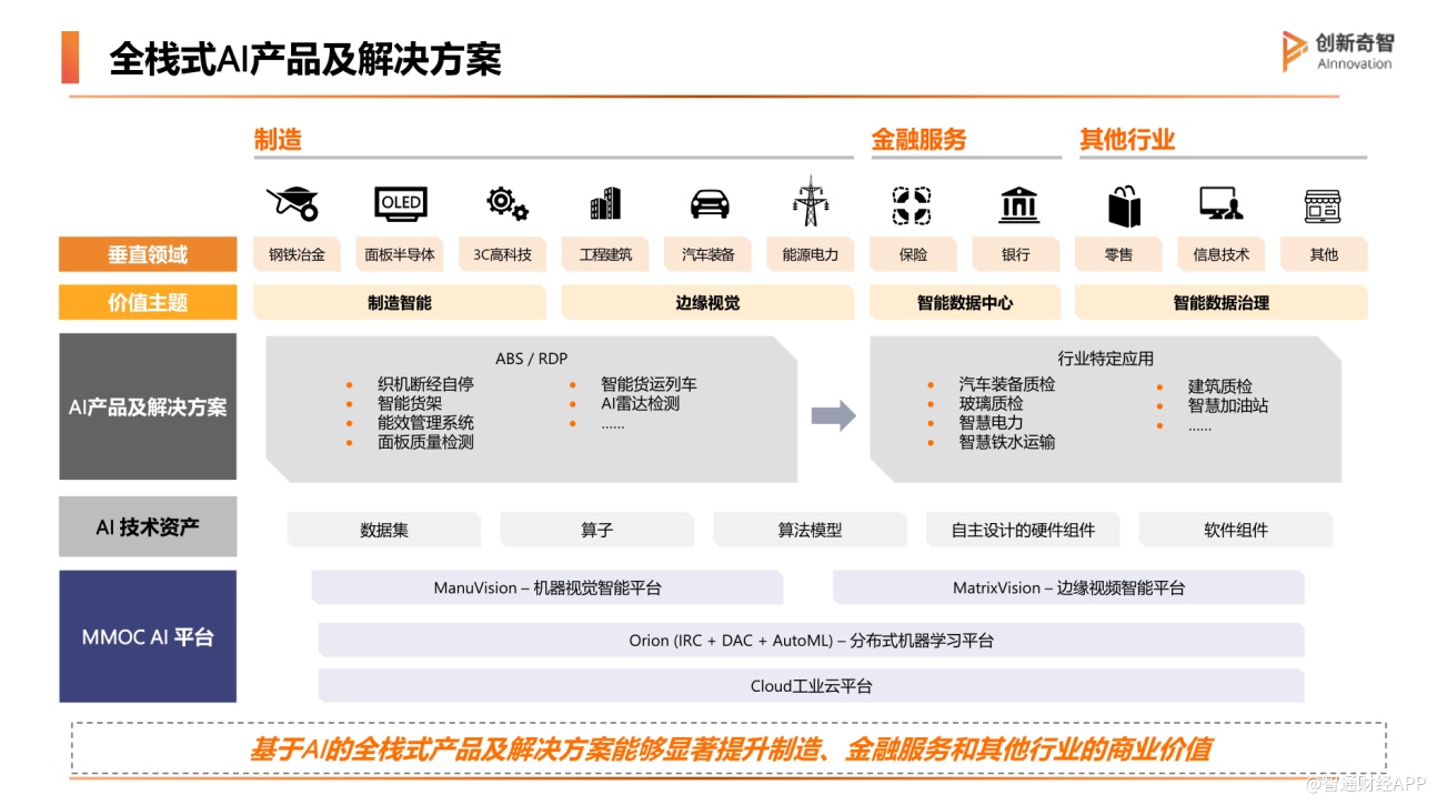 首先,从技术产品层面来看,创新奇智AI产品及解决方案最底层以MMOC AI平台作为支撑。其中,ManuVision和MatrixVision为两个基于计算机视觉的智能平台、Orion为基于深度机器学习的平台。2021年,公司加入了Cloud工业云平台,MMOC完整布局得到进一步夯实,目前已形成了一个完整的云、边、端架构组合。