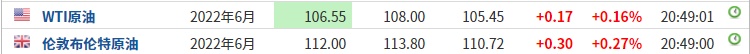 3. 截至发稿,WTI原油涨0.16%,报106.55美元/桶。布伦特原油涨0.27%,报112.00美元/桶。