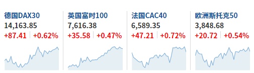 2. 截至发稿,德国DAX指数涨0.62%,英国富时100指数涨0.47%,法国CAC40指数涨0.72%,欧洲斯托克50指数涨0.54%。