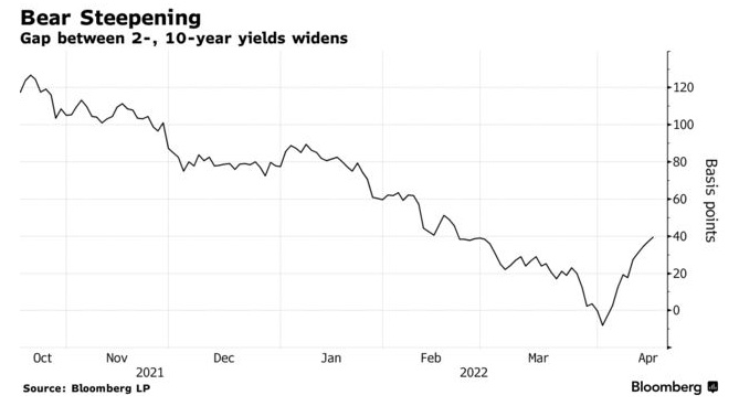 然而,随着越来越多的猜测认为美联储将在下月FOMC会议上加大加息规模,10年期美债收益率一路走高,升至约2.85%,达到2018年末以来的最高水平。2年期和10年期美债收益率曲线在本月早些时候倒挂后也逐渐趋陡,两者收益率之差扩大至约0.40%。