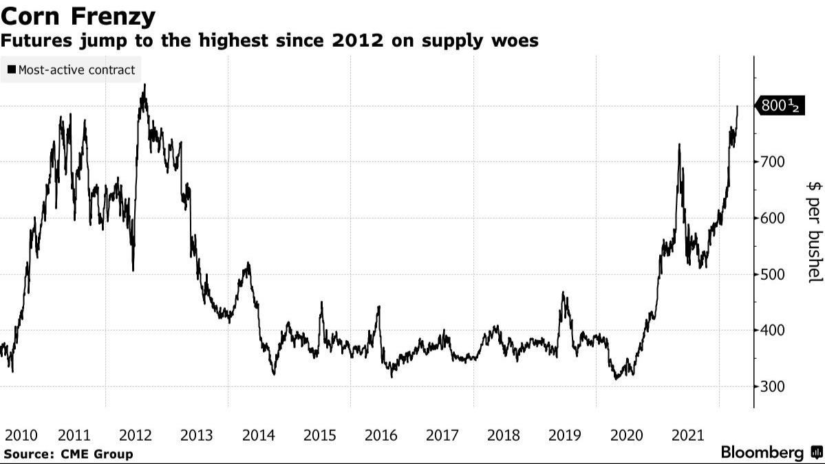 智通财经APP获悉,由于俄乌冲突威胁全球供应,市场对美国谷物的需求增加,芝加哥期货交易所玉米市场交投最活跃的7月合约于当地时间周一(4月18日)报每蒲式耳8.02美元,较前一交易日上涨了18.75美分,涨幅近2.4%。值得一提的是,这是该期货近十年来首次突破每蒲式耳8美元的大关。据悉,2012年该期货升至每蒲式耳8.49美元的历史高位,当时美国中西部地区发生了严重的干旱和高温天气,农作物的种植受到影响。