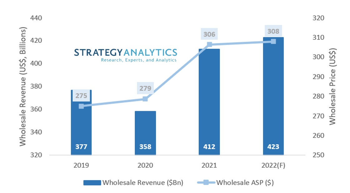 智通财经APP获悉,Strategy Analytics的WSS服务最新研究指出,2022年全球智能手机批发收益将同比增长2%。直到2027年,批发收益将在整个预测期保持向上的轨迹。全球智能手机批发ASP在2021年突破了300美元,这是自2013年以来智能手机行业的最高价格。