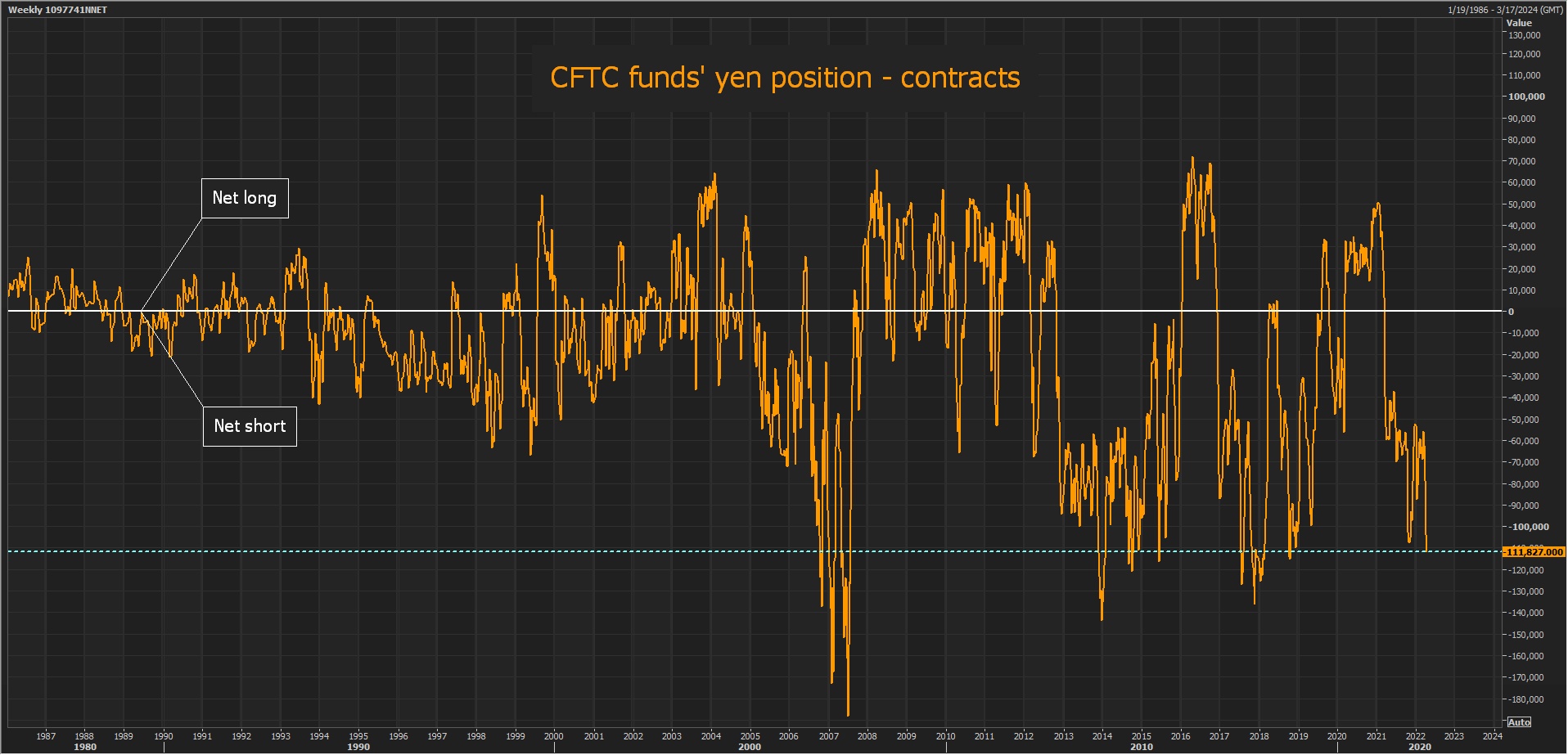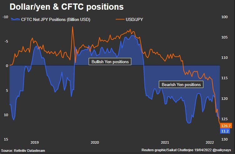 智通财经APP获悉,美国商品期货委员会(CFTC)截至4月12日当周的最新数据显示,对冲基金所持日元净空头仓位从上一周的103,829份升至111,827份,为2018年10月以来最高水平,并且正在接近历史最高水平。