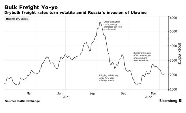ICS主席Esben Poulsson在一次采访中表示,由于担心水雷袭击和军事封锁,有大约80至100艘船只(大部分为干散货运输船)已在乌克兰水域被迫逗留近两个月。目前,由于部分船东和租船人士认为船运服务可能会在更长的时间内受到影响,大宗干散货的航运成本正在上涨。他指出,谷物类粮食的贸易路线正发生重大变化。由于乌俄战争的影响,亚洲和非洲的粮食商需从美洲购入谷物粮食,而航行至美洲的距离无疑要比航行至黑海要远得多。