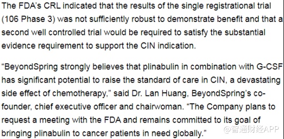 然而去年12月1日,FDA的完全回复函(CRL)却没有给万春医药带来满意的答复,而是驳回了普那布林的上市申请,理由是FDA认为一个三期注册临床不能充分证明治疗获益,要求进行第二项注册临床,以获得充分证据支持CIN适应症的获批。简言之,FDA认为单一注册试验太单薄,无法显示该药的临床益处。