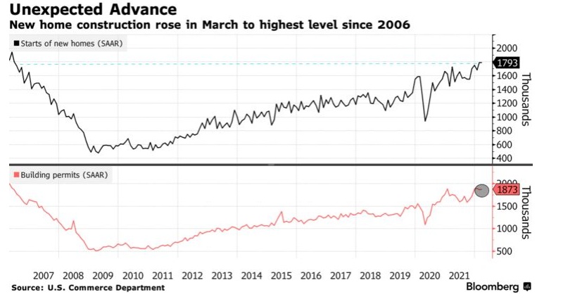 智通财经APP获悉,美国政府周二公布的数据显示,受多户住宅项目提振,3月新屋开工总数年化升至179万户,为2006年以来的最高水平,市场预期为174万户。营建许可总数(反映未来建筑活动)为187万户,市场预期为182.5万户。