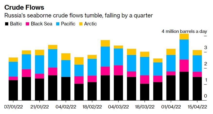 在截至4月15日的7天里,俄罗斯原油海运流量减少了四分之一。从黑海、波罗的海和北极沿海港口运往亚洲的货运量降至两个月来的最低水平。