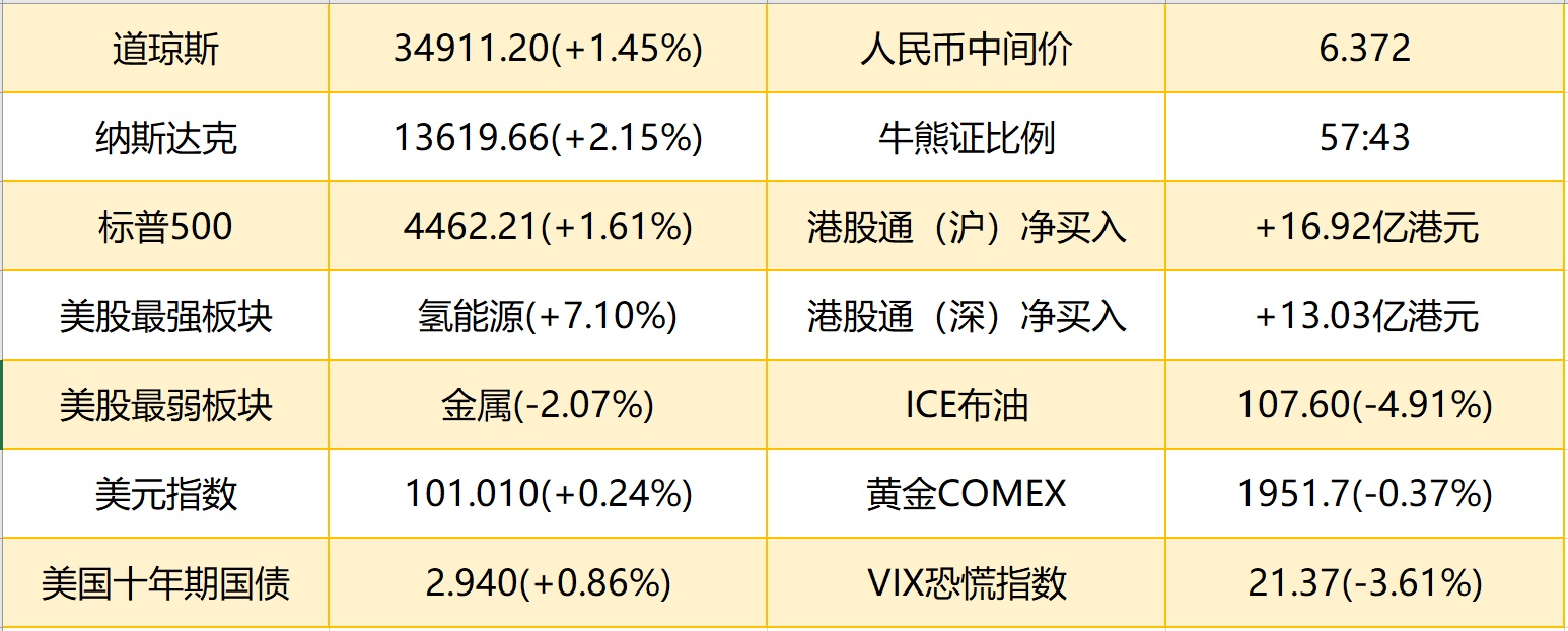 1.隔夜美股美股三大指数集体收涨,道指涨1.46%,标普500指数涨1.61%,纳指涨2.15%,软件、汽车、半导体板块普遍上涨。港股ADR指数上涨,按比例计算,收报21072点,较香港收市涨45.06点或0.21%。
