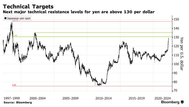 Resona Holdings inc.驻东京首席策略师Shinsuke Kajita表示:“在美国国债收益率持续上升的情况下,美元兑日元的上涨势头现在似乎势不可挡。鉴于目前的市场人气,很难看不到美元兑日元触及130点。”