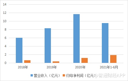 2018-2020年,公司营收分别为6.02亿元、8.31亿元和11.69亿元,复合增速为39.34%;归母净利润分别为0.66亿元、0.41亿元和1.24亿元,复合增速为37.17%。2021年1-6月,公司营收为9.59亿元,归母净利润为1.91亿元,净利润为19,119.10 万元。