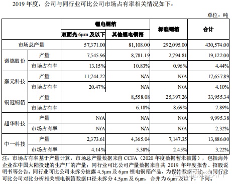智通财经APP根据GGII的调研数据,2020年,中一科技锂电铜箔出货量市占率8.4%,出货量排名全国第四,仅次于龙电华鑫(600621.SH)、诺德股份(600110.SH)、嘉元科技(688388.SH)。2019年,据CCFA 所统计的铜箔行业市场总产量数据及同行业可比公司产量计算,公司市场占有率为3.22%,双面光6μm锂电铜箔市场占有率为4.14%。