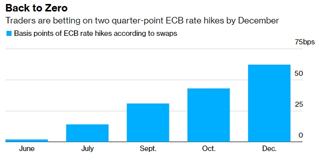欧元区的通货膨胀率达到了创纪录的7.5%,而且还在不断上升,政策制定者们今年正在加紧退出货币刺激政策。货币市场押注7月前加息25个基点、同时9月和12月将加息25个基点的可能性超过50%。
