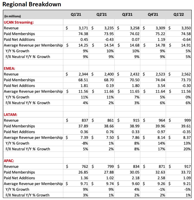 按地区划分,北美地区订阅用户减少64万,欧洲、中东及非洲地区订阅用户减少30万,拉美地区订阅用户减少35万,亚太地区订阅用户新增109万。