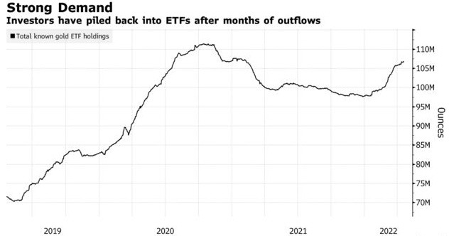 瑞银集团分析师Joni Teves指出,俄乌战争爆发后地缘政治不确定性的增加,也促使质疑美联储加息能力的投资者进行战略投资组合多元化。