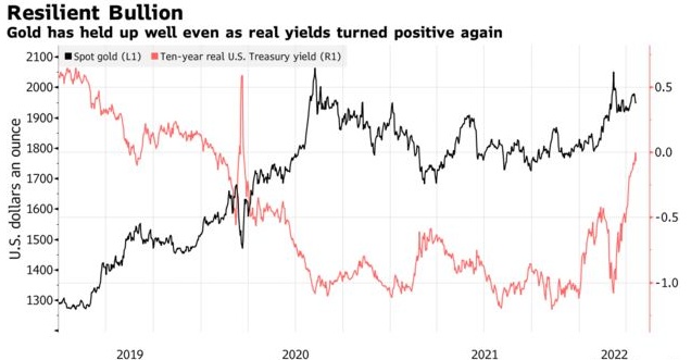不过,对许多观察人士来说,有迹象表明黄金的涨势可能很快就会结束。 周三,经通胀调整的美国国债收益率两年来首次转为正值,而美元汇率接近2020年7月以来的最高水平,使得以美元计价的黄金对外国投资者来说更加昂贵。