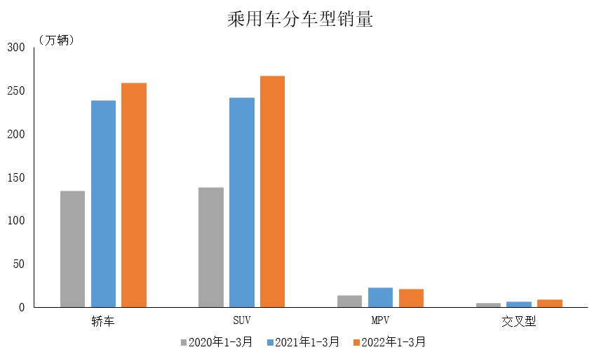 2022年1-3月,在乘用车主要品种中,与上年同期相比,多功能乘用车(MPV)产销均呈下降,其他三大类乘用车品种产销继续保持增长。
