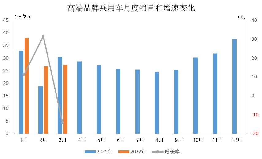 2022年3月,国内生产的高端品牌乘用车销量完成27.3万辆,同比下降14.3%,降幅大于乘用车总体。