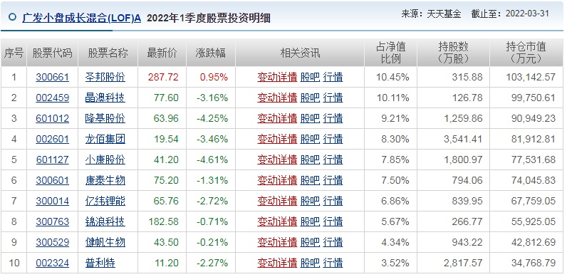 相较于上季度,京东方A(000725.SZ)、高德红外(002414.SZ)退出广发小盘成长前十大重仓股。基金大幅增持锦浪科技(300763.SZ)至第八大重仓股。普利特(002324.SZ)的股票数量保持不变,但仍进入重仓股前十,同时维持晶澳科技(002459.SZ)、康泰生物(300601.SZ)、亿纬锂能(300014.SZ)、健帆生物(300529.SZ)股数不变。减持圣邦股份(300661.SZ)、隆基股份(601012.SH)、龙佰集团(002601.SZ)、小康股份(601127.SH)。