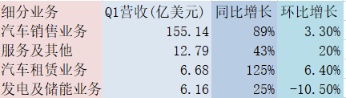 按细分业务来看,汽车业务仍然是拉动特斯拉营收暴增的绝对主力,从过去几年的业绩更可看出汽车业务所占营收比例极大。Q1特斯拉汽车业务(销售+租赁+监管信贷)营收达到168.6亿美元,同比增长87%,占总营收近9成比例,该项业务的毛利率Q1跃升至创纪录的32.9%。在汽车业务之中,汽车销售占比最大,本季度达到155.14亿美元。