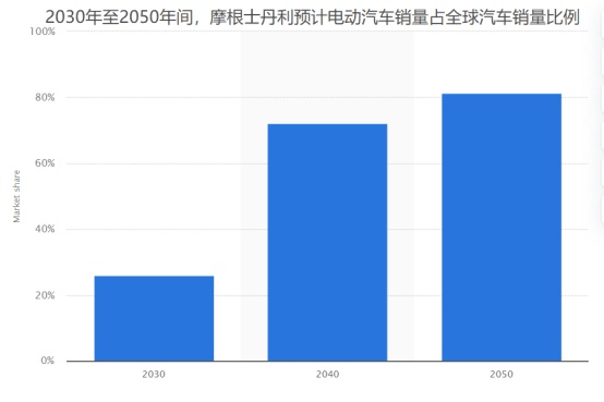 摩根士丹利在一份预测报告中指出,随着美国及全球政府加大对电动汽车行业的政策扶持力度,2030年电动汽车销量占比将达到26%,2040年超过70%。统计数据显示,2021年这一数据约为9%。