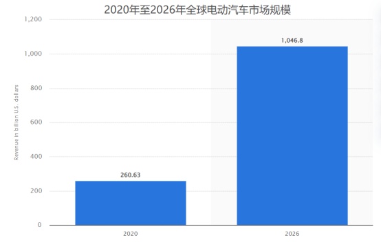 知名市场调研机构Mordor Intelligence于2022年发布的全球电动汽车市场规模预测数据显示,到2026年,电动汽车市场规模将达到10468亿美元。从2020年的统计数据算起,该市场规模年复合增速(CAGR)高达惊人的26%。