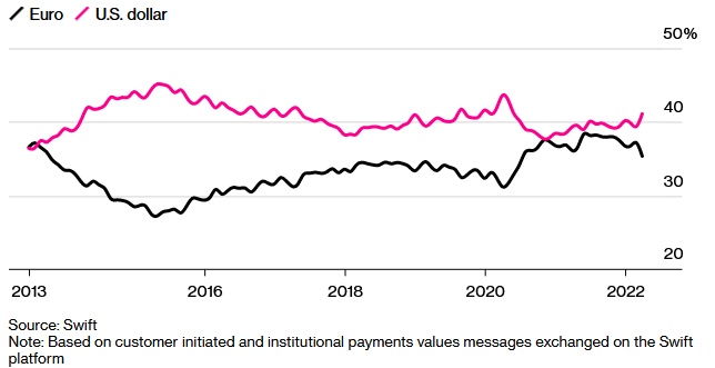 智通财经APP获悉,由于高通胀和俄乌冲突削弱了欧元用于交易的吸引力,欧元作为全球支付货币的使用频率有所下降。环球银行金融电信协会(SWIFT)的数据显示,欧元支付占比在今年3月创下2011年以来最大百分比跌幅,至35.4%。