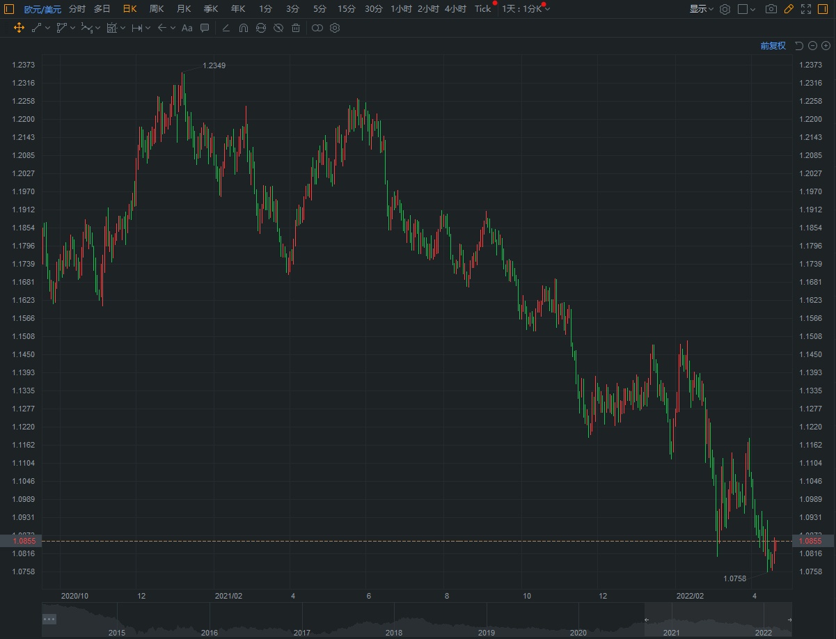 欧元兑美元汇率在过去一年多的时间里连续下跌。截至发稿,欧元兑美元汇率为1.0855,而在2021年1月,欧元兑美元汇率达到了1.2349,显示出市场对欧元信心的下降。