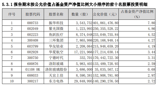 一季度,该基金总体重仓股票变化不大,火炬电子(603678.SH)、首旅酒店(600258.SH)、广发证券(000776.SZ)被剔除出前十大重仓股。振华科技、紫光国微、鱼跃医疗、三环集团(300408.SZ)、华夏航空(002928.SZ)、宁德时代(300750.SZ)、天宜上佳(688033.SH)、东方电热(300217.SZ)获增持。值得注意的是,东方电热被大幅增持154%至第九大重仓股,从1175.04万股被增持至2984.9万股。