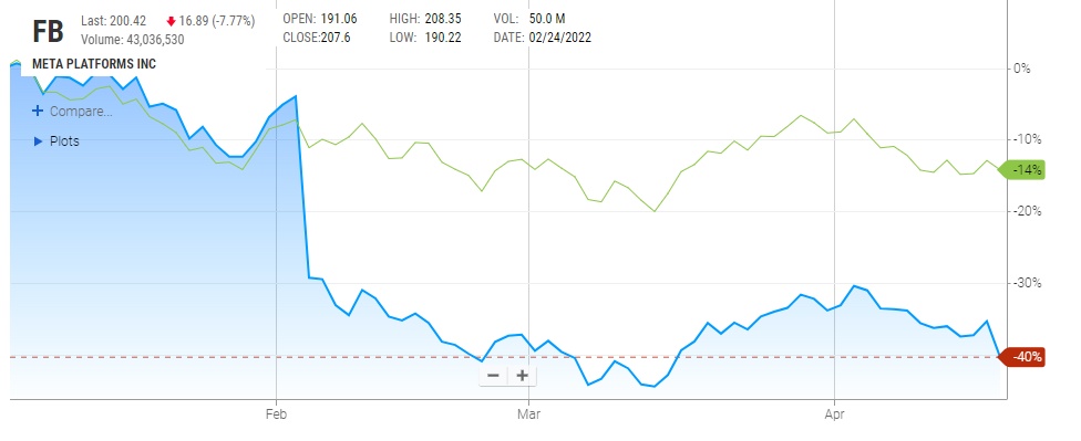 今年迄今为止,纳斯达克100指数下跌14%,Meta股价下跌40%
