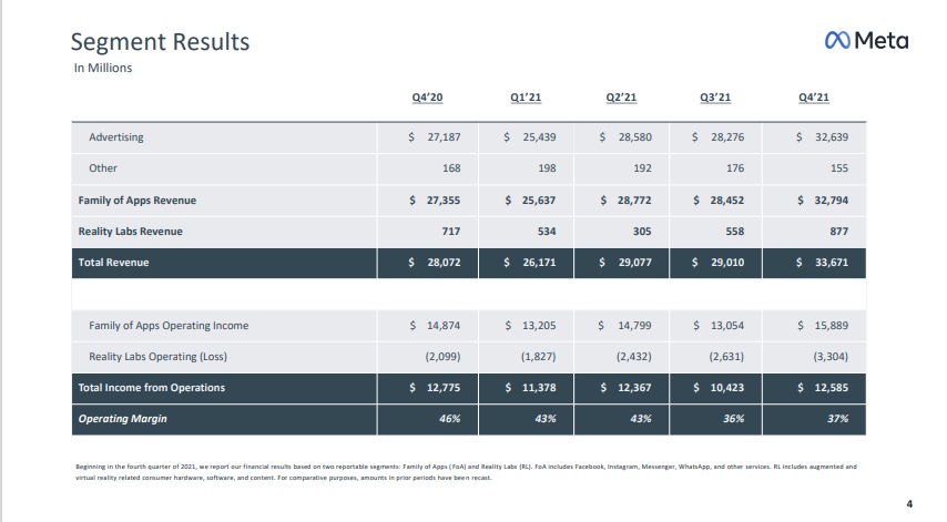 事实上,在去年第四季季度中,Meta的季度营收增长就已经出现放缓,随后管理层预计2022年第一季度的营收会进一步放缓,这是该公司股价近期大幅下跌的主要原因之一。