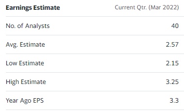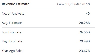 目前,根据雅虎网站上的统计,40所参与对Meta调研的机构给出的2022年第一季度每股收益预期的平均值为2.57美元,其中,最低为2.15美元,最高为3.25美元,去年同期为3.3美元;平均营收预期为282.8亿美元,其中最低为265.5亿美元,最高为294.9亿美元,去年同期为236.7亿美元。