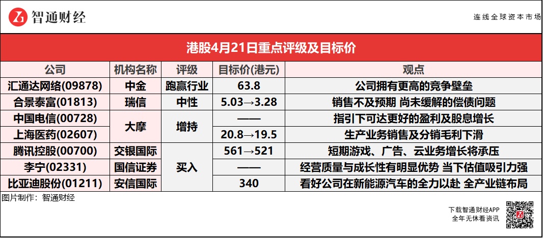 交银国际认为,基于腾讯控股(00700)短期游戏、广告、云业务增长压力,目标价从561港元下调7.1%至521港元。公司将于5月18日发布首季业绩,预计首季度总收入为1405亿元人民币(同比增4%),其中游戏增3%、社交增值服务增3%、金融科技及云增13%、广告降8%,预计调整后每股盈利2.69元人民币(同比降21%),市场预期2.71元人民币。