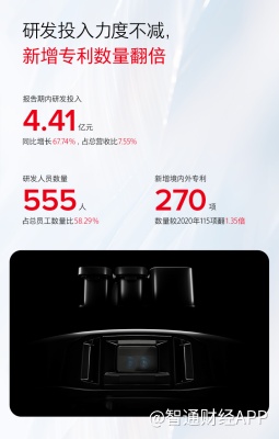 年报显示,截至报告期末,石头科技拥有研发人员555人,占总员工数量比58.29%;全年研发投入4.4亿元,同比增长66.74%,占总营收比7.55%;新增境内外专利270项,数量较2020年115项翻1.35倍,创历史新高。