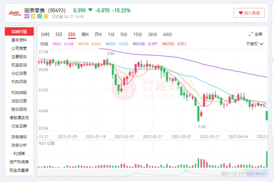 受该消息的影响,今日国美零售股价低开低走,盘中一度大跌逾16%,截至收盘时间,公司股价跌15.22%,收0.39港元/股。