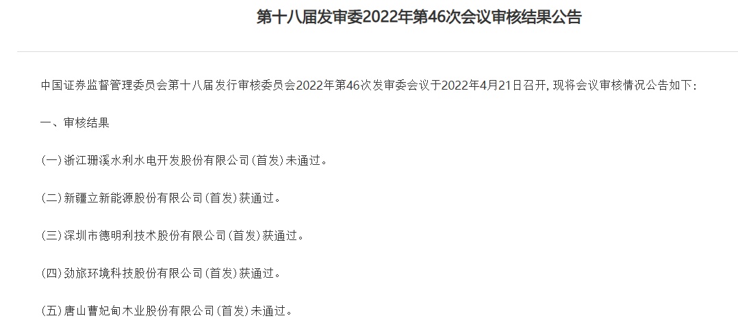 智通财经APP获悉,4月21日,证监会公布第十八届发行审核委员会2022年第46次发审委会议审核结果:新疆立新能源股份有限公司、深圳市德明利技术股份有限公司、劲旅环境科技股份有限公司首发获通过;浙江珊溪水利水电开发股份有限公司及唐山曹妃甸木业股份有限公司首发未通过。