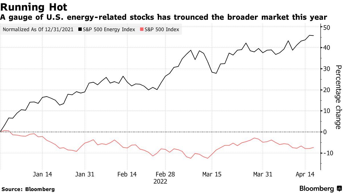 21只成分股组成的标普500能源指数(S&P 500 Energy Index)今年以来的涨幅超过45%,而截至周四收盘,基准股指的标普500指数则下跌超7%。而在之前的10年间,能源股的表现大幅跑输美股大盘。