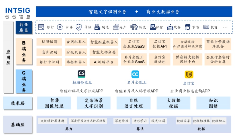 成立于2006年的合合信息以文字识别起家,在经过三年的积累沉淀后,公司于2009至2010年在文字识别的C端领域陆续推出了名片全年王、扫描全能王APP。至2016年,为打造新增长点,合合信息在文字识别领域由C端向B端拓展,公司正式成立企业级智能解决方案事业部,开始针对不同行业复杂场景的文字识别进行更多元化的商业探索。