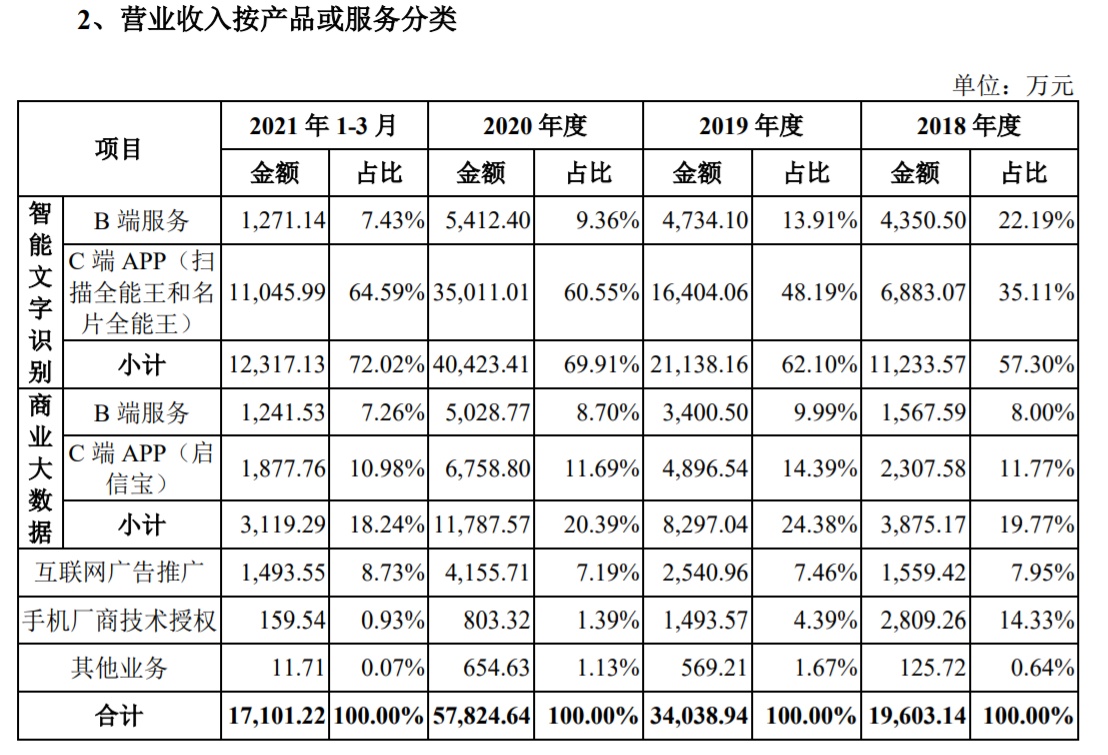 据招股书显示,合合信息是一家人工智能及大数据科技企业,公司通过智能文字识别、商业大数据两大业务板块为全球C端用户及多元行业的B端客户提供数字化、智能化的产品及服务。值得注意的是,扫描全能王、名片全能王、启信宝是合合信息C端业务的3款核心产品。
