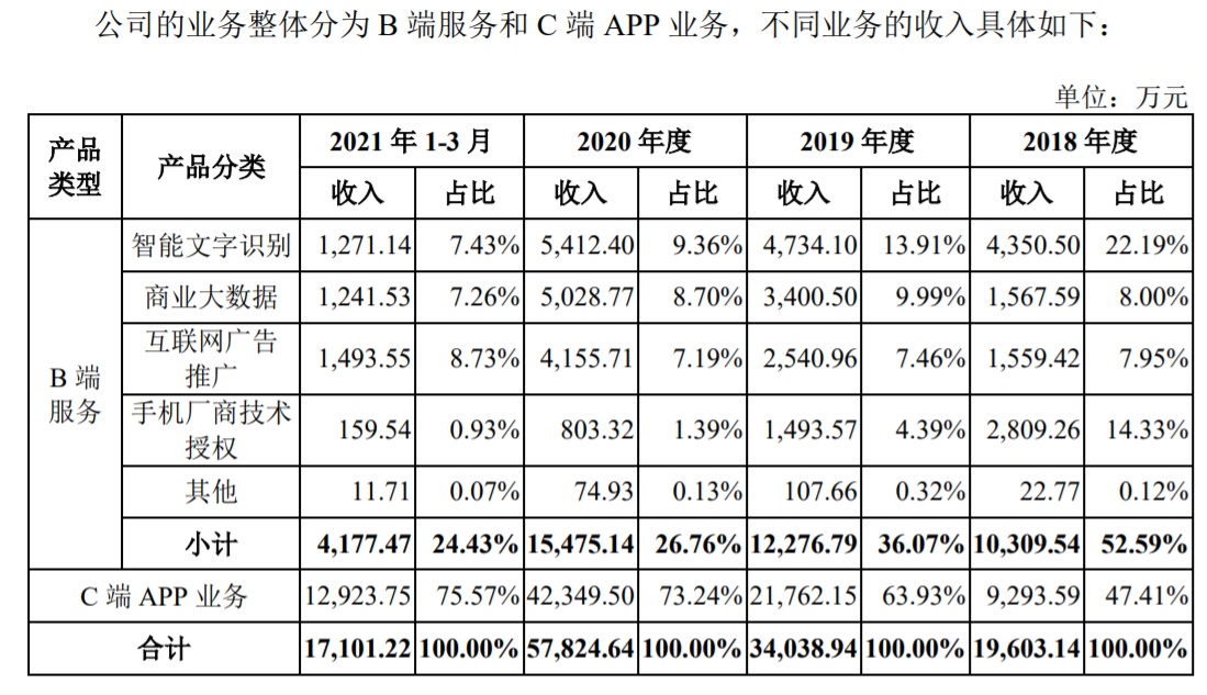 按产品或服务的分类来看,文字识别是合合信息收入的大头,2020年时该业务收入占比69.91%,商业大数据收入占比为20.39%。且该两大业务有一个明显的共同点,即无论是C端亦或是B端,均实现了收入的持续成长。