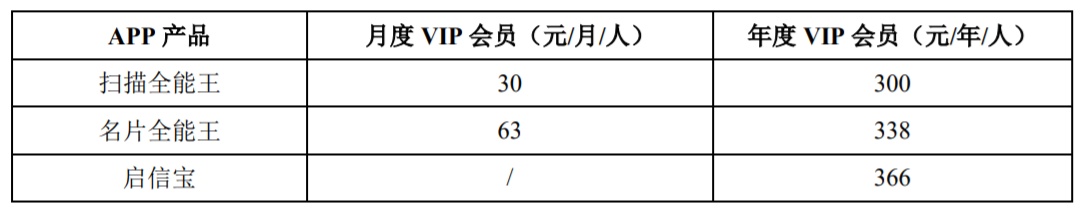 事实上,APP的变现效率主要由付费用户数量、单用户付费价格两个指标决定,而付费用户数量取决于注册用户总量以及付费转化率。在单用户付费价格方面,合合信息做了详细披露,扫描全能王、名片全能王、启信宝的年度VIP会员的收入分别为300元、338元、366元每人每年。