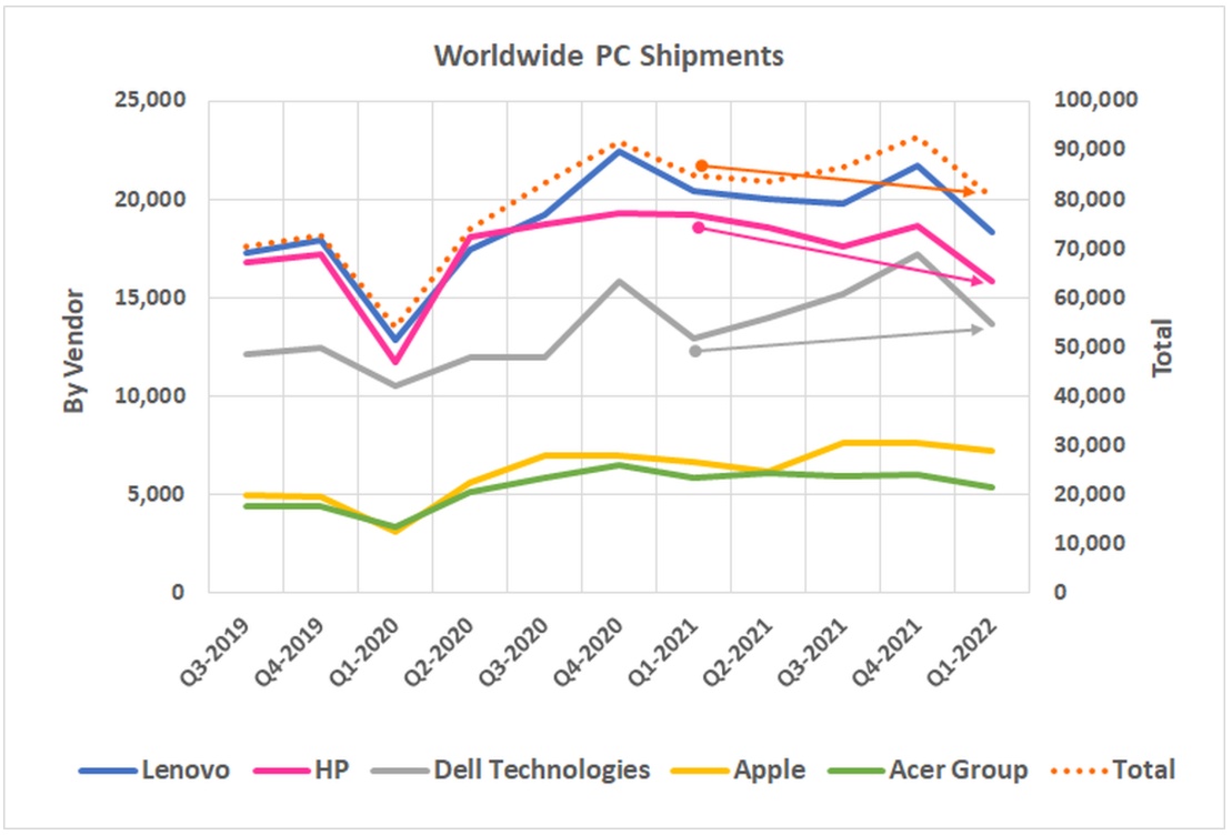 根据行业数据显示,PC销量在2022年第一季度出现同比大幅下降,这似乎表明,多数个人换新需求开始下降。不过,值得注意的是,不同品牌的销量增幅放缓并不像市场预期的那样千篇一律,个体似乎也在这一刻开始分化。