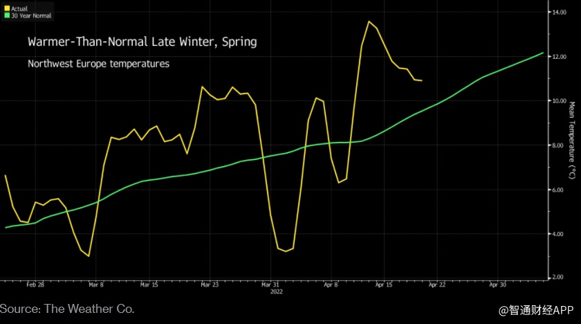 国际能源署在最新的季度报告中表示,如果今年剩余时间的平均天气状况持续下去,供暖需求预计将低于2021年,“当时欧洲面临一个持续到4月的特别漫长的供暖季节”。