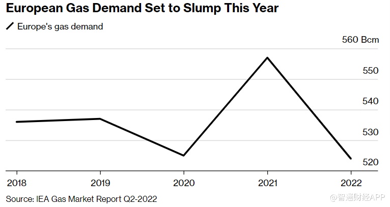 国际能源署在其季度报告中称,在过去的供暖季节,欧洲的天然气需求同比下降了近4%,预计2022年全年将收缩6%。在价格高企的情况下,工业天然气需求将下滑到接近2020年的水平,当时企业受到与疫情相关的经济低迷的冲击。
