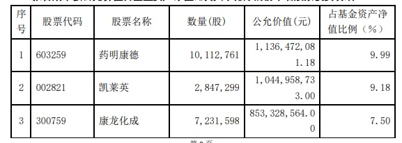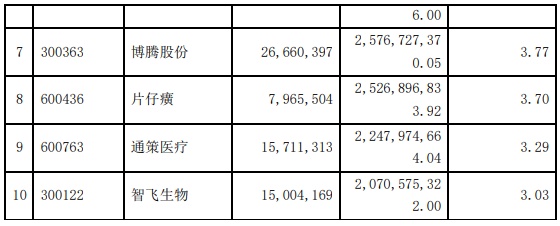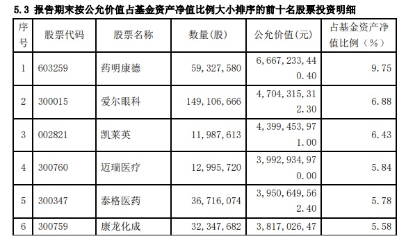 具体持股变动方面,智飞生物(300122.SZ)获增持成为该基金新晋前十大重仓股,九洲药业(603456.SH)退出前十大。迈瑞医疗(300760.SZ)、爱尔眼科(300015.SZ)、泰格医药(300347.SZ)、智飞生物(300122.SZ)、片仔癀(600436.SH)也都被增持,增减持幅度均未超过10%。其中,爱尔眼科获增827.6万股,智飞生物(300122.SZ)被加仓了45.86万股晋升前十。此外,虽然减持了638.84万股药明康德(603259.SH),但该股占资产净值比例仍为第一。