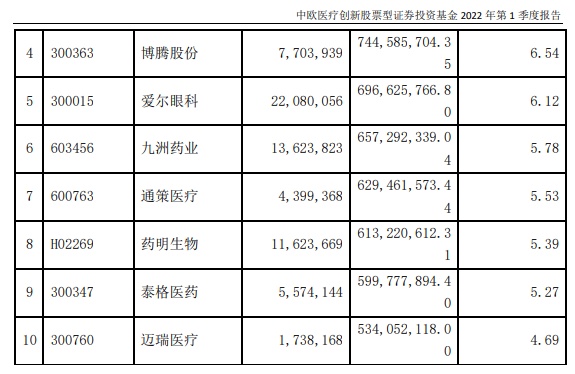 不过,在葛兰管理的另一只超百亿规模基金——中欧医疗创新股票的前十大重仓股中,九洲药业(603456.SH)的持股数并未变化。此外,在该基金上,葛兰一季度还加仓了康龙化成(300759.SZ)、药明康德(603259.SH)、爱尔眼科(300015.SZ)、通策医疗(600763.SH)、泰格医药(300347.SZ)、迈瑞医疗(300760.SZ)。报告期内,该基金A类份额净值增长率为-15.83%,同期业绩比较基准收益率为-8.93%。