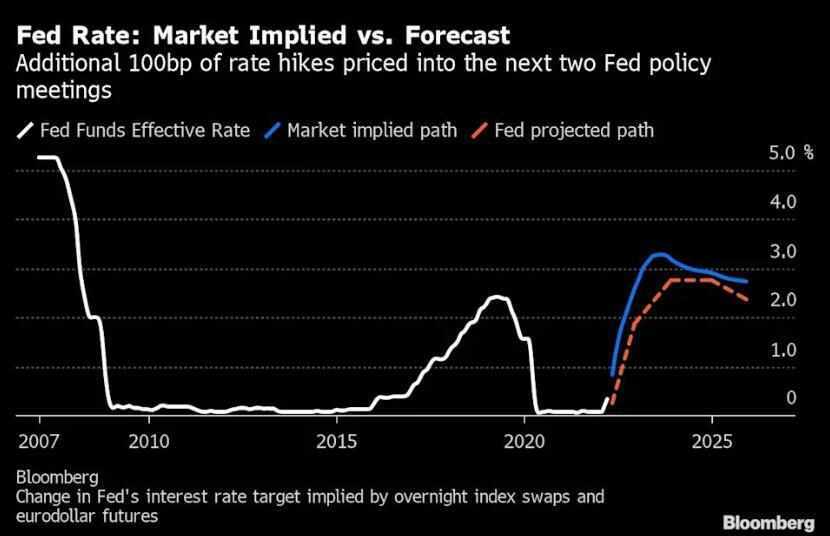 4月7日,布拉德再度放鹰。布拉德指出,基于规则的方法表明美联储需要将其基准短期借款利率提高到3.5%左右,以控制通胀。布拉德称:“如果考虑到前瞻指引,情况并不那么糟糕,虽然仍然落后于曲线,但并没有看起来那么大的差距。”值得注意的是,布拉德提出的3.5%远高于市场对利率水平的定价;数据显示,市场彼时预计美联储的基准利率将达到2.5%-2.75%。
