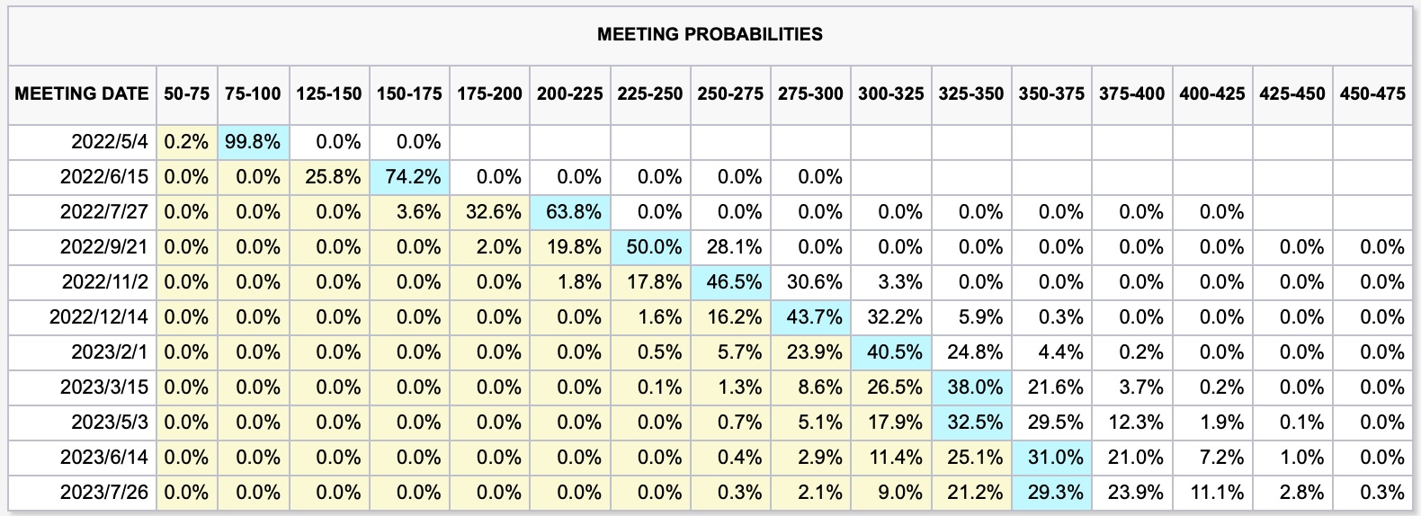 美联储主席鲍威尔4月21日发表“噤声期”前的压轴讲话之前,在美联储官员们将近一个多月时间的放鹰预热之下,美国短期利率交易员4月20日便已经颇为主动地把美联储5月和6月每次都将加息50个基点的市场隐含概率推高至100%。