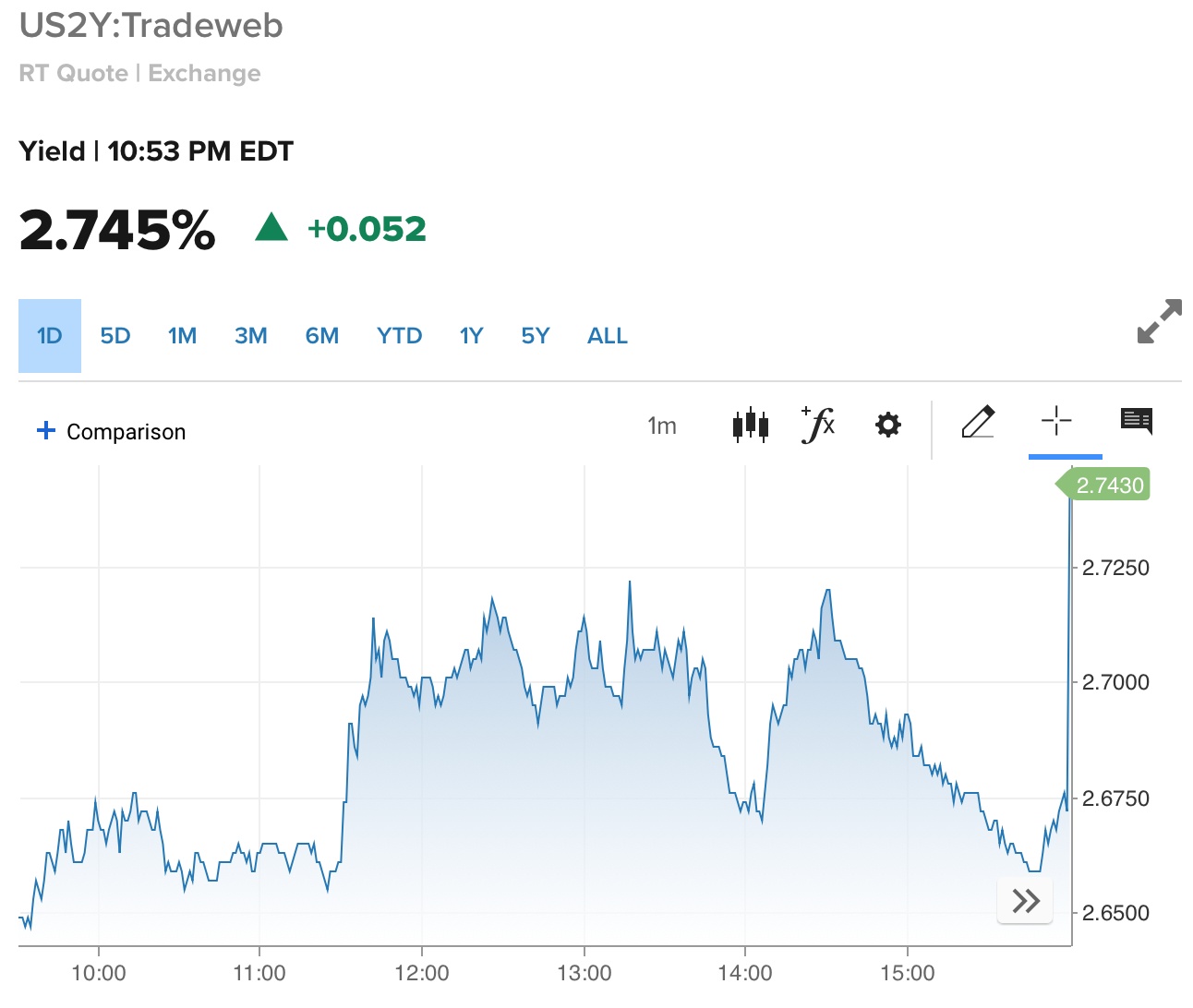 截至发稿,在美国国债市场上,对政策敏感的2年期美债收益率也一度升至近2.74%的周期新高,为2018年12月以来的最高水平,而年初时该收益率还仅约0.75%。